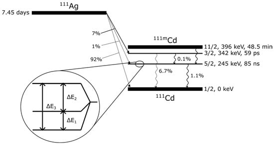 Nuclear decay of 111Ag. The probabilities of the various decay routes are given per 111Ag decay. The decay of 111mCd (another commonly used PAC isotope) is also indicated to demonstrate that the hyperfine splitting of the same intermediate level (I = 5/2, 245 keV) is probed in γ-γ PAC spectroscopy in the two radionuclides, although the first γ differs for the γ-γ cascade in 111Ag PAC and 111mCd PAC.