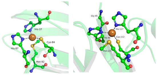 Small blue copper proteins take part in the transport of electrons. The prototypical example is plastocyanin, transporting electrons in photosynthesis from cytochrome b6/f, diffusing as Cu(I)-plastocyanin to associate with and transfer the electron to photosystem I. The metal site is composed of two histidine residues and one cysteine residue in a distorted trigonal planar structure, with an additional methionine residue at an axial position and with an unusual distance from the metal ion to the thioether sulfur of around 3 Å, see Figure 2. The metal site is assumed to be rigid, and crystallographic data indicate that there is very little difference in the Cu(I) and Cu(II) coordination geometry [34], presumably facilitating rapid electron transfer. In a broader perspective, these so-called type I copper sites are an important class of Cu-binding sites which are present in many copper-containing proteins, most notably in blue multicopper oxidases.