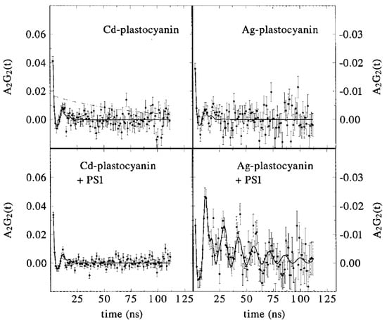 111Ag- and 111mCd PAC time traces recorded for plastocyanin in the absence and presence of photosystem I. Left panels: 111mCd PAC data for plastocyanin in the absence (top) and presence (bottom) of photosystem I. Right panels: 111Ag PAC data for plastocyanin in the absence (top) and presence (bottom) of photosystem I. Data points indicated with error bars, and fit (solid lines) using Equation (1) with exponential damping due to rotational diffusion. The data for 111Ag PAC are multiplied by −1 for easy comparison with the 111mCd PAC data. Reprinted with permission from ref. [28]. Copyright American Chemical Society 1999.