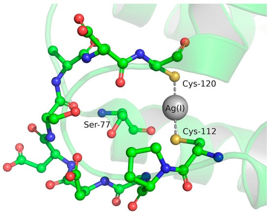 Metal site of CueR. Ag(I) is bound in an almost linear structure by two cysteinates, and the backbone carbonyl oxygen of Ser77 from the other monomer of the homodimeric protein is located near the metal ion (pdb code: 4WLW [42]). Figure produced with PyMOL [37].
