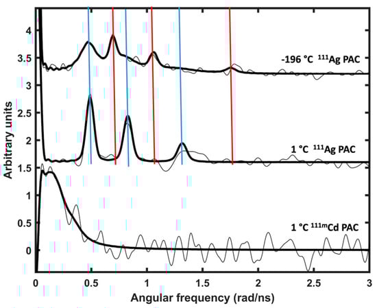 In PAC spectroscopy, the hyperfine interactions between the nuclear magnetic and/or quadrupole moments of the probe nucleus and the local magnetic fields and/or electric field gradients (EFGs) are measured through the perturbed angular correlation of a - cascade in the nuclear decay. In this review, we will focus solely on interactions between the nuclear quadrupole moment of the PAC nucleus and the EFG of its surroundings, i.e., the nuclear quadrupole interaction (NQI). An EFG is a signature of the local electronic and molecular structure surrounding the PAC probe site, and if the EFG is time-dependent, dynamics may also be explored typically on the ps–ns time scale. The NQI gives rise to hyperfine splitting of the nuclear energy levels of the probe nucleus, and this energy splitting is measured via PAC spectroscopy for the intermediate level of the - cascade. For a nucleus with spin I = 5/2, such as the relevant nuclear level of many PAC probes including 111Ag, the intermediate energy level is split into three sublevels with transition frequencies of , , and between these sublevels. Note that this invokes the rule that . These frequencies serve as a fingerprint for the local structure at the probe site.