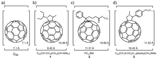 The fullerene derivative 1 C60(C6H15N) (Figures S2 and S3) was synthesized according to a previously reported procedure [31]; the fullerene derivative 2 C60(C12H14O2), PC61BM (>99.5%, HPLC) was purchased from Luminescence Technology Corp; the fullerene derivative 3 C60(C17H27NO) was prepared according to the procedure outlined in Scheme 1.