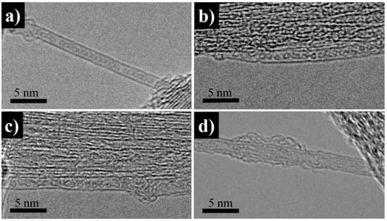 HR-TEM images of (a) C60@SWNTs, (b) 1@SWNTs, (c) 2@SWNTs, and (d) 3@SWNTs.