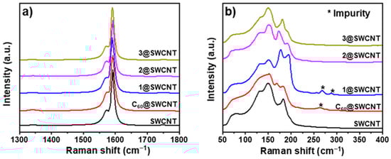 Raman spectra of the C60@SWCNT, 1@SWCNT, 2@SWCNT, and 3@SWCNT peapods and empty SWCNTs in the ranges of (a) 1300–1800 cm−1 (D bands and G bands) and (b) 50–400 cm−1 (RBM bands). The Raman spectra were obtained with an excitation wavelength of 532 nm, at room temperature.
