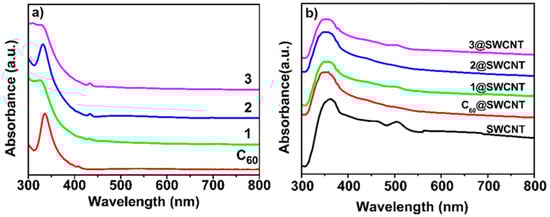 UV-Vis absorption spectra of (a) C60, 1, 2 and 3 dissolved in CS2; (b) 1@SWCNTs, 2@SWCNTs, 3@SWCNTs, C60@SWCNTs, and empty SWCNTs dispersed in ethanol.