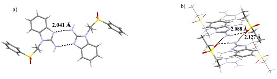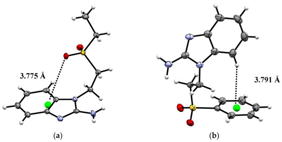 Despite the difference in the terminal substituent, both the seabz and sfabz ligands crystallize in a P 21/n space group, within a monoclinic crystal system. However, these two ligands show different intramolecular interactions. For the seabz ligand, one of the oxygen atoms in the sulfone group is orientated towards the benzimidazolic ring, due to a lone pair···πbz interaction at 3.775 Å (Figure 2a), as has been observed in purine nucleobases, where the lone pair···π interactions are evenly distributed in the intersection of the fused aromatic rings, [51,52].