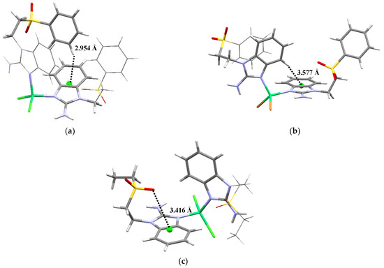 Intramolecular interactions for (a) [Ni(sfabz)2Cl2], depicting a H···πbz, (b) [Ni(sfabz)2Br2], depicting a H···πbz and (c) [Ni(seabz)2Cl2], depicting a lp···πbz.
