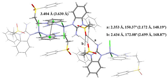 Two compounds with Zn(II) and sfabz were obtained, crystallizing in a triclinic system and a P-1 space group. Angles and bond distance around the metal ion are summarized in Table 5. Although compound 10 depicts an acetone molecule in the crystal structure, this does not seem to affect the intramolecular interactions, as both Zn(II) sfabz complexes depict a H···π contact with one benzimidazolic ring acting as the donor, and the other one as the acceptor, with a distance of 3.404 Å for compound 9 and 3.630 Å for compound 10. In contrast with the NiX2 derivatives discussed above, where the crystal structure is either stabilized through either hydrogen bonds with the sulfone or through π stacking between the benzimidazolic rings, compounds 9 and 10 depict both interactions at the same time with one neighboring molecule. Figure 7 shows the intermolecular interactions for compound 9, as an example with the relevant angle and distances. The corresponding values for compound 10 can be found in parenthesis in the same figure.