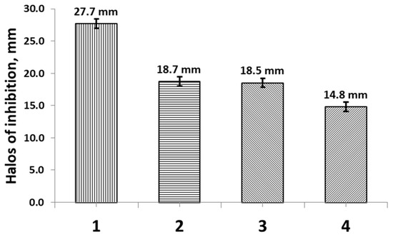 The Saccharomyces cerevisiae fungi were used as a test system to research the antimycotic activity of the [Ag(C22H17ClN2)2]NO3·2H2O complex [24]. The system incubation (30 °C, 24 h) was followed by measuring the halo of inhibition of the east fungi growth with up to 0.1 mm accuracy. The “blank experiments” involved preparations of clotrimazole and silver nitrate whose content corresponded to their content in the complex under study (Figure 1).