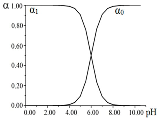 Distribution diagram of clotrimazole particles, depending on the solution pH: α1—HClm+, α0—Clm (CClm = 0.01 mol/L, lgB1 = 5.99).
