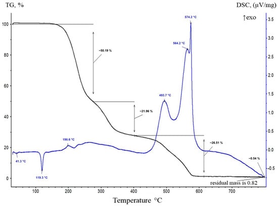 The thermal behaviour of the synthesised cocrystals/salts was analysed by means of thermogravimetric analysis. The presence of endoeffects when the sample mass does not change in the thermograms of Clm∙HNic (Figure 5) and 2Clm·H2Sal allows for the determination of their melting temperatures of 119.3 and 114.4 °C, respectively. These temperatures are lower than the melting temperatures of the initial components (148, 237, and 159 °C for Clm, HNic, and H2Sal). This fact can be an indirect confirmation of the formation of cocrystals/salts since the mixtures of two substances (especially of the eutectic type) are known to frequently crystallise at a lower temperature than that of the individual components. The confirmation of the formation of cocrystals/salts consists of the fact that their thermal decomposition proceeds along with the elimination of the initial components: clotrimazole gaining the endoeffect in the temperature range of ~(200–400) °C; acids gaining the exoeffect at ~(400–800) °C (a thermal decomposition scheme of the cocrystal/salt Clm·HNic is provided):