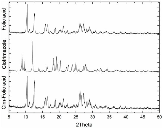 Diffraction patterns of powders of folic acid, clotrimazole, and the binary 2Clm–H2Fol system; (new reflexes are absent from the binary system).