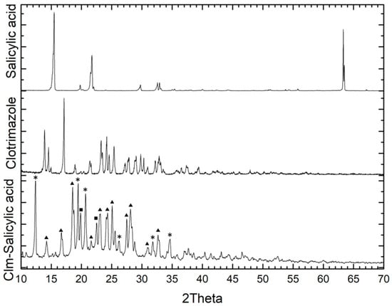 Diffraction patterns of the powders of the binary 2Clm–H2Sal system and the initial components. Symbols: * represents peaks that are absent from the diffraction patterns of the initial substances; ■ and ▲ represent peaks that correspond to salicylic acid and clotrimazole.