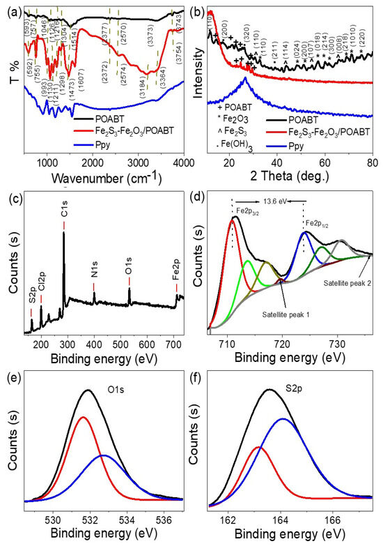 The chemical estimation of Ppy, POABT, and Fe2S3-Fe2O3/POABT nanocomposite using (a) FTIR and (b) XRD. (c) XPS survey, (d) Fe, (e) O, and (f) S elements XPS analyses for Fe2S3-Fe2O3/POABT nanocomposite.