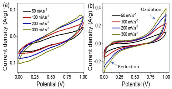 Cyclic voltammetry testing was carried out on the Fe2S3-Fe2O3/POABT SC, both with/without Ppy material addition, within the paste. This experimental procedure is illustrated in Figure 4a,b, respectively. When the scan rate was altered within the range of 50 to 300 mV.s−1, the plates’ capacity exhibited an upward trend. This capacity enhancement was reflected in the resultant increase in the generated current. The presence of Ppy in the paste resulted in a significant enhancement in the current density [39]. This enhancement is evident in the heightened oxidation and reduction peak values, indicative of enhanced charge transfer due to Ppy’s presence. This phenomenon underscores the efficient charge storage capability of Ppy nanoparticles within the paste. The electrochemical function of Ppy is interconnected with its initial role, which involves enhancing the homogeneity of the supercapacitor paste. This enhanced homogeneity simplifies the even distribution of the paste across the plates, ultimately aiding in its electrochemical performance. Moreover, the presence of OH− groups from the electrolyte increases the semiconductor nature of the paste [40], which in turn increases its ability to store charges [41,42], In addition to the great ability of Fe2S3 and Fe2O3 to perform charge storage related to their semiconductive nature. The findings indicate a noteworthy enhancement in charge storage capacity and overall performance of the Fe2S3-Fe2O3/POABT supercapacitor with the incorporation of Ppy into the paste. This addition of Ppy material substantially boosted the supercapacitor’s ability to store and manage electrical charges, underscoring its potential for improved energy storage applications.