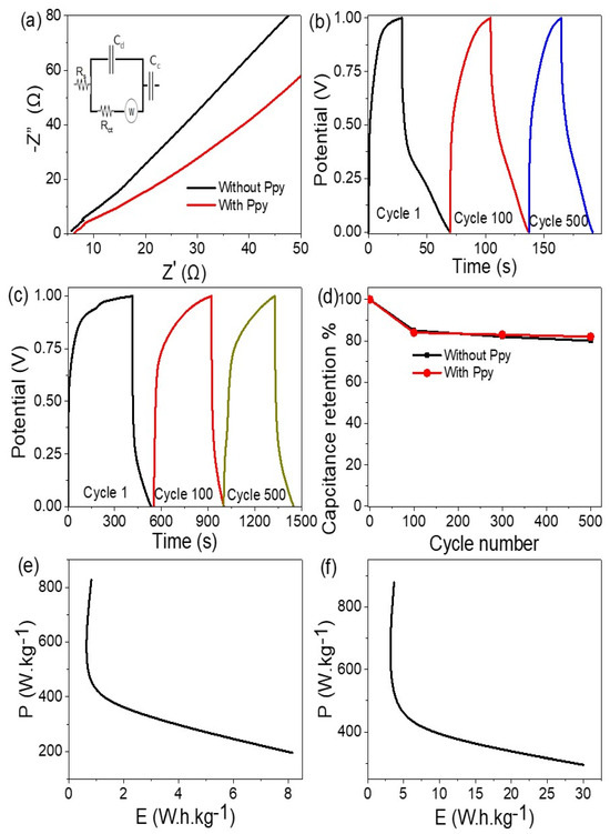 Moreover, the power density (P) is expressed using Equation (4) [13] and illustrated in Figure 5e,f through a Ragone plot, elucidating the connection between stored energy and the duration of energy transfer. Notably, the influence of Ppy became markedly evident, leading to a substantial enhancement in power density. Prior to the inclusion of Ppy, the power density registered at 820 (W/kg), whereas after Ppy integration, it reached an impressive 880 (W/kg).