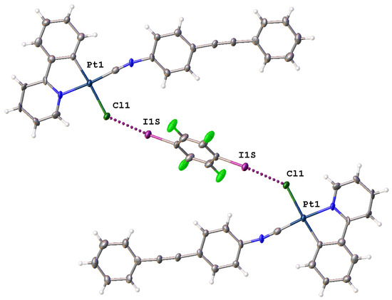 The crystallization of [Pt(ppy)Cl(CNC6H4-C≡C-Ph)] and 1,4-DITFB from MeCN solutions at RT was found to lead to 1·½(1,4-DITFB) adduct (Figure 1). Only one type of crystal was obtained despite significant variation in the crystallization conditions (e.g., temperature, rate of evaporation). The peak position of the experimental PXRD pattern from solids obtained by solvent evaporation of a solution of a mixture of 1 and 1,4-DITFB taken in a 1:2 molar ratio matched well with the simulated PXRD pattern obtained from the single-crystal X-ray structure 1·½(1,4-DITFB), confirming the homogeneity of the sample and ruling out the presence of another phase (Figure S1.4, see Supplementary Materials).