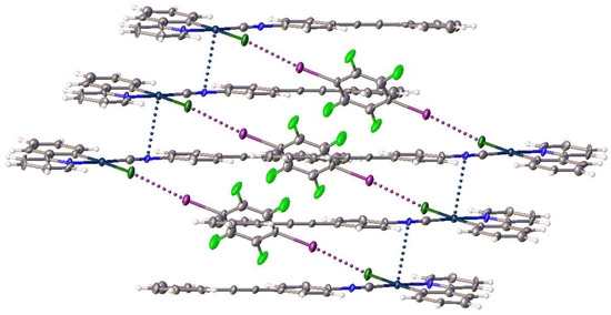 Noncovalent interactions of 2D ladder-type architecture. Purple dotted line indicates the Pt–Cl···I–C HaBs, dark blue—the NCN⋯Pt contact.