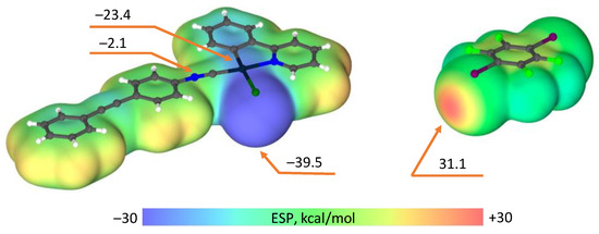 The comparison of the minima of the electron density (ED) and the electrostatic potential (ESP) along the binding path also allowed us to verify the affinities, since, in the case of a polar noncovalent interaction, the ESP minimum shifts towards the nucleophilic atom and the ED minimum shifts towards the electrophilic site [107]. The analysis of the 1D profiles of the ED and ESP functions [108] along the I···Cl bond path showed the clear nucleophilic nature of the Cl atom with the shift in the ESP minimum toward it, whereas the ED minimum shifted toward the electrophilic I atom, which also confirmed the HaB nature of these noncovalent C–I···Cl–Pt interactions (Figure 8, Left). At the same time, for the NCN⋯Pt interaction, the ED and ESP minima almost overlapped with the feeble Pt-directed ESD and C-directed ED minima shifts, meaning that the NCN⋯Pt interaction should be regarded as a π-hole(CN)⋯dz2(Pt) interaction, with the N atom as an electrophile and the Pt center as a nucleophile (Figure 8, Right).