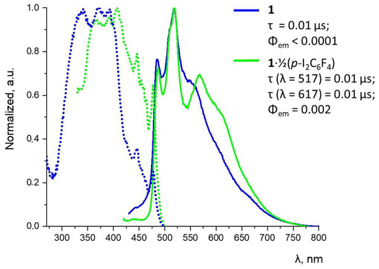 The photophysical properties of 1·½(1,4-DITFB) co-crystals were studied in the solid state and were compared with the photophysical properties of 1, which were previously described [37]. Similarity to 1, the luminescence spectra of 1·½(1,4-DITFB) (Figure 9) were broad, partially structured, and, in accordance with the literature data, could be assigned to a metal-perturbed 3LC intraligand transition with a small admixture of 3MLCT [37]. The difference between 1 and 1·½(1,4-DITFB) is that the adduct showed an additional longer-wavelength emission band in the 550–750 nm region. These findings can be interpreted in terms of the formation of bi-molecular states such as ground-state dimers and/or excited states—excimers [109]. Monoexponential transient decays were observed for the emission at 517 nm and at 617 nm. The lifetimes obtained from exponential decay fits were characterized by τobs = 0.03 μs in both cases. In addition, the co-crystallization of 1 with 1,4-DITFB provided to increase the Φem up to 0.02%, whereas the 1 was extremely weakly emissive at RT. These data are coherent with our DFT computational data indicating a significant dimerization energy for supramolecular associates, which is likely to have affected the increase in molecular rigidity. Therefore, our results and other examples of adducts of cyclometallated platinum complexes with perfluoroarenes or haloperfluoroarenes shown in Figure 1 indicate that, in all cases, the formation of adducts led to an increase in the quantum yield of phosphorescence, with insignificant spectral changes.