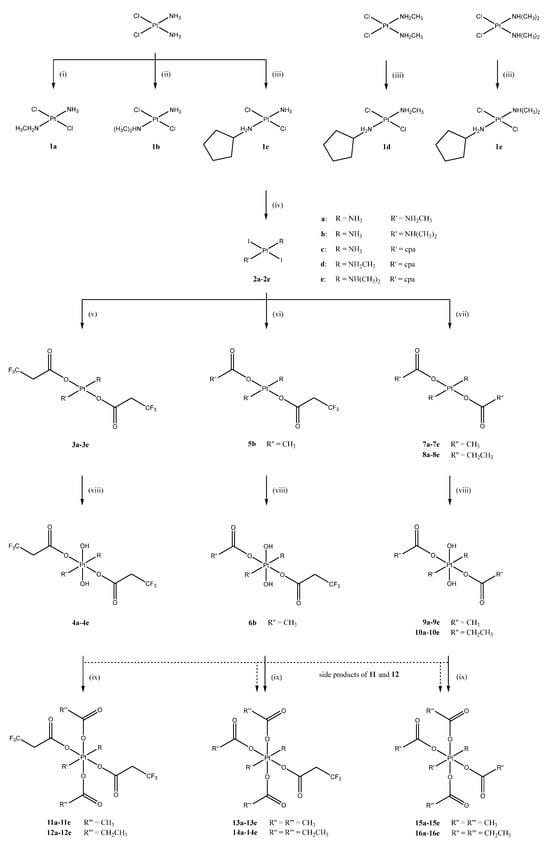 The synthesis of a series of compounds 1 and 2 was adapted from procedures previously published by our group (Scheme 1) [16]. The trans-configured complexes 1a–1e were obtained via the reaction of (SP-4-2)-diamminedichloridoplatinum(II), (SP-4-2)-dichloridobis(methylamine)platinum(II), or (SP-4-2)-dichloridobis(dimethylamine)platinum(II) with methylamine, dimethylamine, or cyclopentylamine (cpa) under moderate heating in aqueous solution. Afterwards, concentrated HCl was added to the intermediately formed tetraamine complexes and refluxed overnight, forming substances 1a–1e based on the trans effect [24]. Subsequently, ligand exchange via reaction with potassium iodide led to complexes 2a–2e. The further reaction with Ag2SO4 and the removal of the formed AgI resulted in the corresponding aqua complexes, which were added to an aqueous solution of Ba(OH)2 and acetic acid, propionic anhydride, or CF3CH2COOH. This approach was adapted from a previously published procedure [25]. Subsequently, formed BaSO4 was filtered off and compounds 3a–3e, 5b, 7a–7e, 8a–7e could be obtained as crude products and were used without purification. The following oxidation with hydrogen peroxide led to platinum(IV) complexes 4a–4e, 6b, 9a–9e, 10a–10e. As a last step, carboxylation was achieved by the reaction of the crude dihydroxidoplatinum(IV) complexes with acetic or propionic anhydride under an argon atmosphere. The final products 11a–16e were obtained after purification via RP-HPLC (Scheme 1).