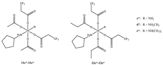 The crucial reaction step was the introduction of the trifluoropropanoato ligands in equatorial position in order to produce complexes 4a–4e. However, this reaction step did not work in every case; monocarboxylatoplatinum(II) complexes and analogues with no carboxylato ligand at all were isolated. Consequently, mono(trifluoropropanoato) (13a–13e, 14a–14e) and tetracarboxylato complexes (15a–15e, 16a–16e) were obtained as side products of substances 11a–11e and 12a–12e.