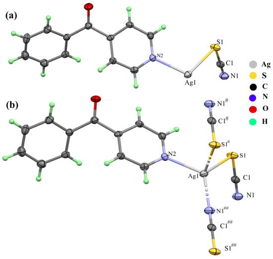 In the light of the interesting structural and supramolecular structure properties of Ag(I) thiocyanato complexes, we report herein the synthesis of two new Ag(I)-CPs with 4-benzoyl pyridine (4BP) (Figure 2), using thiocyanate as a linker. The structure of the synthesized complexes was verified using single-crystal X-ray diffraction analysis. In addition, Hirshfeld calculations were used to investigate the supramolecular architectures of the studied complexes.