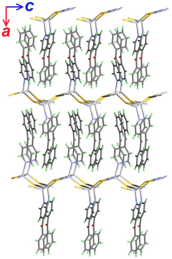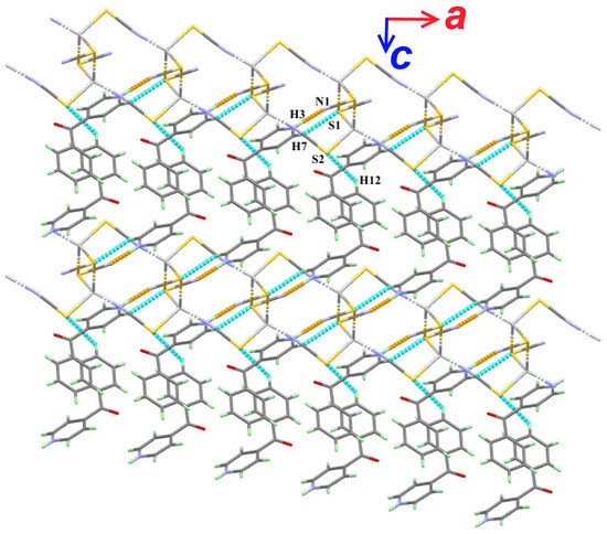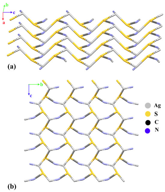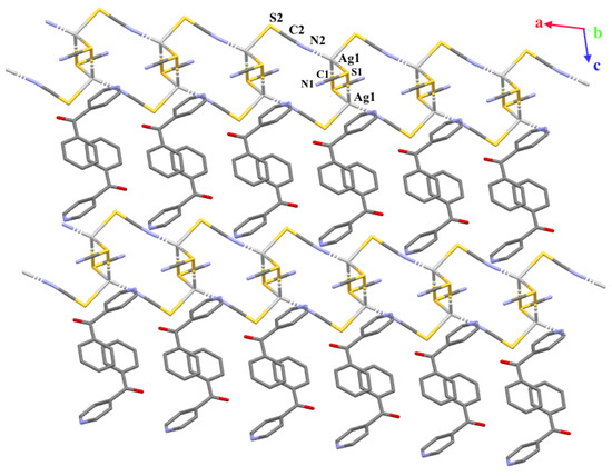 Each thiocyanate anion exhibits a µ1,1,3-(S,S,N-) bridging mode, which binds three Ag(I) centers leading to a boat-like ten-membered ring. These repeating units are fused together to generate a 2D wavy-like structure extended along the ac plane (Figure 4a). As a result, each sulfur atom connects two silver atoms, one from its own unit and the other from another adjacent unit, leading to zig-zag chains extended along the c-direction, where the Ag–S–Ag angle is 155.04(4)°. These polymeric chains are further connected by the coordination interaction between the Ag(I) ion and N-atom from the third thiocyanate group, which extends the coordination polymer along the b-direction leading to the 2D polymeric structure shown in Figure 4b. The angles of the thiocyanate groups are nearly linear (179.7(4)° and 158.2(3)° for S1–C1–N1 and C1##-N1##-Ag1, respectively) while the Ag1–S1–C1 acquires bent conformation, with angles 96.34(12)° for Ag1–S1–C1 and 94.97(11)° for Ag1–S1#–C1#. These results are consistent with the mesomeric structure of the thiocyanate group [69,75]. The 4BP organic ligand acts as a terminal monodentate ligand via the pyridine N-atom and thus is not included in the polymer expansion but is found located above and below the polymeric zig-zag chains (Figure 5).