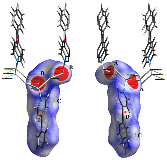 Full dnorm map for the [Ag(4BP)(SCN)]n (1). The most significant interactions are (A) Ag-S, (B) Ag-N, (C) C···H and (D) O···H.