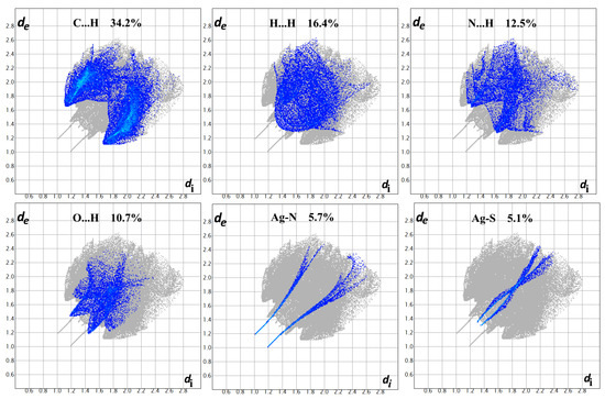 Hirshfeld 2D fingerprint plots for the most significant (Ag-N, Ag-S, O…H and C…H) interactions and other contacts (H…H and N…H), which have a high percentage in complex 1.