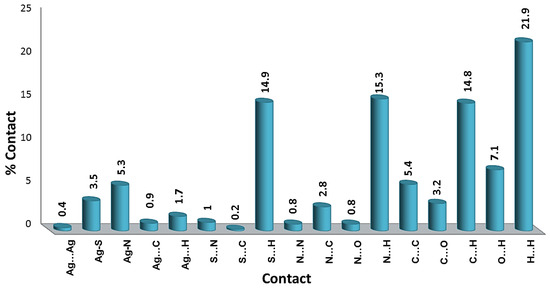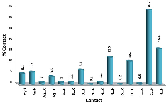 Also, the supramolecular structure of the [Ag(4BP)(SCN)]n complex is affected by other numerous weak interactions. Figure 11 displays a summary of all contacts and their contributions to the molecular packing of this complex. The significant C…H (34.2%), hydrogenic H…H (16.4%) and N…H (12.5%) interactions are the most frequent interactions.