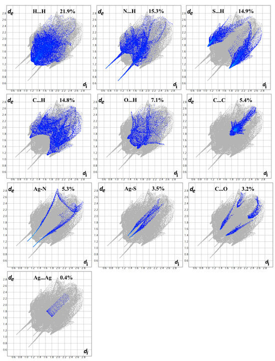 Hirshfeld 2D fingerprint plots of the most significant (Ag-N, Ag-S, N…H, S…H, C…O and Ag…Ag) interactions and other contacts (H…H, C…H, O…H and C…C) that contribute with a high percentage to the stability of complex 2.