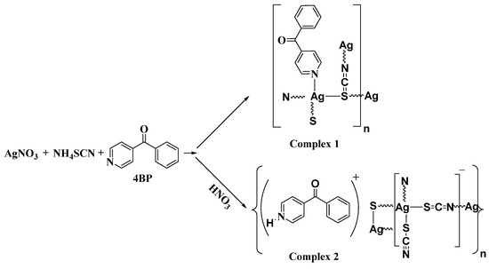 The X-ray structures of the Ag(I) complexes with 4-benzoylpyridine with different anions such as CF3COO− and NO3− were previously reported in the literature [61,62]. The former complex [Ag(4BP)2]2(CF3COO)2 is dinuclear through a strong argentophilic interaction connecting the two [Ag(4BP)2] cationic units [61] while the latter [Ag(4BP)2](NO3).H2O is monomeric [62]. In both cases, the 4-benzoylpyridine molecule is acting as a monodentate ligand via its pyridine N-atom, and no close contacts were found between the Ag(I) ion and the carbonyl group. For [Ag(4BP)2]2(CF3COO)2, the nonpolar C···H (26.2%) and the polar O···H (15.6%) interactions were found to be the most important in the molecular packing. In this work, we present the synthesis of two new Ag(I) complexes with 4-benzoylpyridine (4BP) in the presence of thiocyanate (SCN−) as a bridging ligand. Schematic illustration for the synthesis of the two complexes is shown in Scheme 1. The two complexes were prepared using almost the same reagents, which are AgNO3, 4BP and NH4SCN. The only difference is the addition of 1:1 (v/v) HNO3 in the synthesis of 2. After mixing, the resulting clear solutions were left for slow evaporation at room temperature. After a few days, both complexes were formed in crystalline forms, which are suitable for single-crystal X-ray diffraction analysis. Based on the CIF data, the Hirshfeld calculations were used to investigate the intermolecular interactions of the studied complexes.