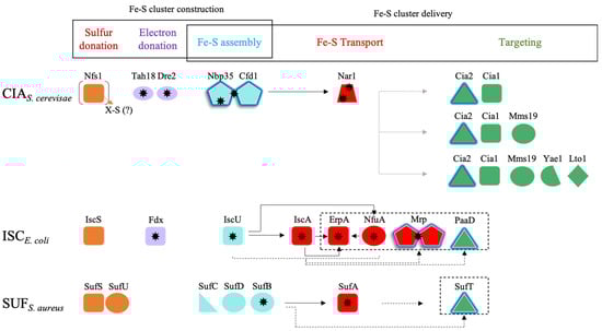 Eukaryotes have acquired the ISC and SUF systems by endosymbiosis, presumably with ancestors of α-proteobacteria and photosynthetic cyanobacteria, respectively. While the first endosymbiosis event is thought to be the origin of mitochondria, the second event gave rise to plastids. This evolutive scenario explains why in eukaryotes the ISC system locates in the mitochondria, and the SUF system in plastids [,]. In the anerobic parasitic protist Entamoeba histolytica that possesses a reduced mitochondrion-related organelle (MRO) called mitosome, the ISC system is missing but a minimal NIF system is present, possibly acquired by horizontal gene transfer from ε-proteobacteria [,]. In all eukaryotes, cytoplasmic and nuclear Fe-S proteins acquire their cluster by a dedicated Fe-S cluster biogenesis system CIA (cytosolic iron-sulfur assembly) that functions downstream of the ISC system [,,]. Detailed description of how the CIA pathway is connected to the ISC system is outside the scope of this review, and more information can be found in reviews from Braymer et al., 2021 and Maio et al., 2020 [,]. Briefly, the prevalent model is that the CIA system uses as the source of sulfur a sulfur-containing molecule (X-S) that is synthetized inside the mitochondria thanks to the core components of the ISC system, and which is exported to the cytoplasm by the ABC transporter Atm1 []. Alternatively, another model postulates the existence, at least in mammalian cells, of cytosolic ISC components that would supply sulfur to the CIA system [].