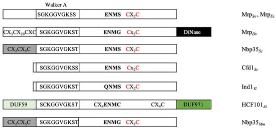 Schematic representation of members of Mrp/Nbp35 subfamily. Bacterial, archaeal and eukaryotic members of the Mrp/Nbp35 subfamily with distinct specificity in their primary sequence are represented (E. coli Mrp, S. enterica Mrp, S. cerevisiae Nbp35 and Cfd1, Arabidopsis thaliana HCF101, Yarrowia lipolytica Ind1, Methanococcus maripaludis Nbp35). Coordinating cysteines of the transferable Fe-S cluster are in red. The conserved Walker A motif that interacts with the α- and β-phosphate moieties of the nucleoside and the magnesium ion is indicated. The sequence replacing the NKXD motif, which leads to a loss of specificity for GTP is indicated in bold. An amino-terminal domain (grey) with typical [4Fe-4S] cluster binding motif is found in archaeal homologs of Mrp and in eukaryotic Nbp35. Mrp from Desulfovibrio vulgaris Hildenborough (MrpDv), possesses a C-terminal dinitrogenase iron-molybdenum cofactor biosynthesis domain (Di-Nase) (black), and a non-canonical motif containing cysteines residues in its N-terminal domain (white). HCF101 possesses at its N- and C-terminus two additional domains: DUF59 that composes the monodomain Fe-S cluster biogenesis factor SufT from S. aureus, and DUF971 a domain of unknown function. The mitochondrial transit peptide of Ind1Yl and the chloroplast transit peptide of HCF101At are not represented.