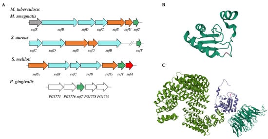 Schematic representation of the chromosomal location of the sufT genes and architecture of SufT proteins. (A) The chromosomal region containing sufT in M. tuberculosis H37Rv, Mycobacterium smegmatis, community-acquired methicillin-resistant S. aureus subsp. aureus USA300_FPR3757, S. meliloti 1021, and Porphyromonas gingivalis W83 strains is shown. The intein element inserted in M. tuberculosis sufB gene is not represented []. The PG1775, PG1776, PG1778 and PG1779 genes are predicted to putatively code for the nucleotide exchange factor GrpE, the chaperone protein DnaJ, a putative UDP-2,3-diacylglucosamine hydrolase and an O-acetyl-ADP-ribose deacetylase, respectively []. Genes are color-coded according to their role in Fe-S cluster biogenesis as in Figure 1. The gene encoding the transcriptional regulator SufR is indicated in grey. Genes with no demonstrated experimental link with the SUF biogenesis machinery are depicted by white arrows. (B) Ribbon diagram of the structure of SufT (BA_5281) from Bacillus anthracis obtained by X-ray diffraction (PDB ID: 3LNO). The conserved Cys residue is highlighted in red. (C) Crystal structure of the Drosophila melanogaster CIA targeting complex containing the DUF59 protein CIAO2B (blue), MMS19 (light green), and CIAO1 (dark green) (PDB ID: 6TC0) []. The conserved Cys residue of CIAO2B is highlighted in red.