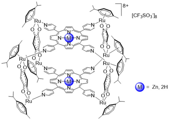Molecular structures of the metalla-assemblies: 2H-TPyP-arene-Ru (M = 2H) or Zn-TPyP-arene-Ru (M = Zn).