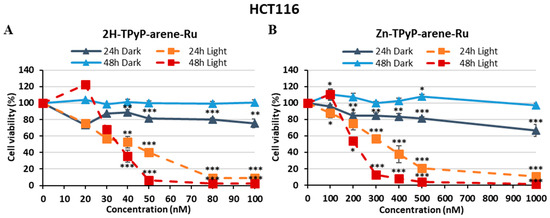 Photocytotoxic effect of 2H-TPyP-arene-Ru (A) and Zn-TPyP-arene-Ru (B) on HCT116 cells. Cells were seeded in 96-well plates and cultured for 36h before being treated or not with 2H-TPyP-arene-Ru or Zn-TPyP-arene-Ru. After 24 h incubation, cells were irradiated or not with a 630–660 nm CURElight lamp at 75 J/cm2 (PhotoCure ASA, Oslo, Norway). MTT assays were performed at 24 and 48 h after irradiation, and cell cytotoxicity was expressed as a percentage of each treatment condition compared with untreated cells. Data are presented as mean ± SEM (n = 3). * p < 0.05; ** p < 0.01 and *** p < 0.001.
