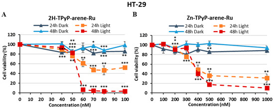 Photocytotoxic effect of 2H-TPyP-arene-Ru (A) and Zn-TPyP-arene-Ru (B) on HT-29 cells. Cells were seeded in 96-well plates and cultured for 36 h before being treated or not with 2H-TPyP-arene-Ru or Zn-TPyP-arene-Ru. After 24 h incubation, the cells were washed and irradiated or not with a CURElight lamp from 630–660 nm at 75 J/cm2 (PhotoCure ASA, Oslo, Norway). MTT assays were performed at 24 and 48 h after irradiation, and cell cytotoxicity was expressed as a percentage of each treatment condition compared with untreated cells. Data are presented as mean ± SEM (n = 3). * p < 0.05; ** p < 0.01 and *** p < 0.001.
