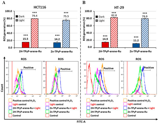 ROS generation by TPyP-arene-Ru on HCT116 (A) and HT-29 (B) cell lines. Cells were treated or not with 2H-TPyP-arene-Ru or Zn-TPyP-arene-Ru at IC50 concentrations. The cells were labeled with DCFDA and irradiated or not. ROS production was then quantified via flow cytometry and interpreted using the % positive fluorescence values given in the tables. *** p < 0.001.
