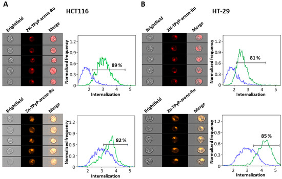 Cellular internalization of TPyP-arene-Ru in HCT116 (A) and HT-29 (B) cells. Cells were treated with 2H-TPyP-arene-Ru and Zn-TPyP-arene-Ru at IC50 concentrations. After 24 h incubation, the fluorescence of 2H-TPyP-arene-Ru (excitation: 405 nm; emission: 650 nm) and Zn-TPyP-arene-Ru (excitation: 561 nm; emission: 655 nm) was analyzed via flow cytometry coupled to AMNIS® image analysis. In graphs, cells treated with TPyP-arene-Ru complexes (green line) were compared to untreated cells (blue line).