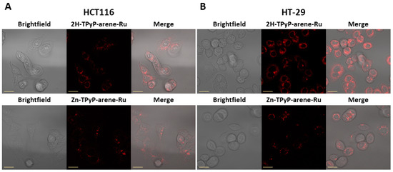 Cellular internalization of TPyP-arene-Ru by confocal microscopy on HCT116 (A) and HT-29 (B) cells. Cells were seeded at the appropriate density and cultured for 36 h in an incubation chamber with a coating of type I collagen and acetic acid. Cells were then treated with 2H-TPyP-arene-Ru (excitation: 405 nm; emission: 650 nm) and Zn-TPyP-arene-Ru (excitation: 561 nm; emission: 655 nm) at IC50 concentrations. Fluorescence of both compounds was determined via confocal microscopy, and cell internalization was determined using the Image J image-processing software (version 1.54f). Images show the different treatment conditions. Yellow scale bar = 20 µm.