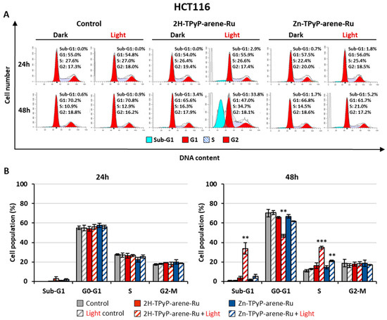 Effects of photoactivation of TPyP-arene-Ru on the cell cycle distribution in HCT116 cells. Cells were grown for 36 h in an appropriate culture medium before exposure or not to 2H-TPyP-arene-Ru or Zn-TPyP-arene-Ru complexes at IC50 concentrations. After 24 or 48 h incubation, cells were irradiated or not with a 630–660 nm CURElight lamp at 75 J/cm2 (PhotoCure ASA, Oslo, Norway), then subjected to flow cytometry analysis using PI staining after PDT. Images of cell cycle analysis (A) are representative of three separate experiments. Results of flow cytometry analysis are represented by histograms (B) that display the percentage of cells in each cell cycle phase. Data are shown as mean ± SEM (n = 3). ** p < 0.01 and *** p < 0.001.