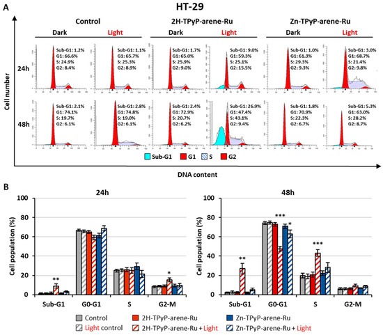 Effects of photoactivation of TPyP-arene-Ru on the cell cycle distribution in HT-29 cells. Cells were grown for 36 h in an appropriate culture medium before exposure or not to 2H-TPyP-arene-Ru or Zn-TPyP-arene-Ru complexes at IC50 concentrations. After 24 or 48 h incubation, cells were irradiated or not with a 630–660 nm CURElight lamp at 75 J/cm2 (PhotoCure ASA, Oslo, Norway), then subjected to flow cytometry analysis using PI staining after PDT. Images of cell cycle analysis (A) are representative of three separate experiments. Results of flow cytometry analysis are represented by histograms (B) that display the percentage of cells in each cell cycle phase. Data are shown as mean ± SEM (n = 3). * p < 0.05; ** p < 0.01 and *** p < 0.001.