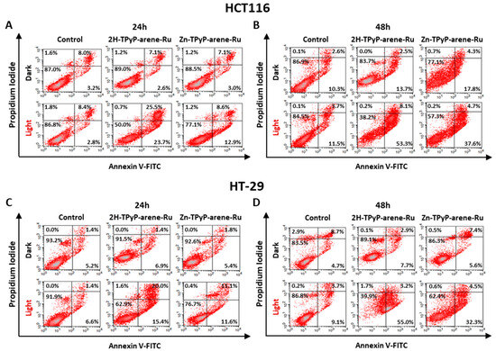 Apoptosis effects of photoactivation of TPyP-arene-Ru on HCT116 (A,B) and HT-29 (C,D) cell lines. Cells were grown for 36 h in an appropriate culture medium before exposure or not to 2H-TPyP-arene-Ru or Zn-TPyP-arene-Ru complexes at IC50 concentrations. After 24 or 48 h incubation, cells were irradiated or not with a 630–660 nm CURElight lamp at 75 J/cm2 (PhotoCure ASA, Oslo, Norway). HCT116 and HT-29 cells were also stained 24 h post-PDT (A–C) and 48 h post-PDT (B–D) with Annexin V-FITC and PI, and apoptosis was analyzed via flow cytometry. The upper right quadrant represents the percentage of late apoptosis, and the lower right quadrant represents early apoptosis. Images shown are representative of three separate experiments.