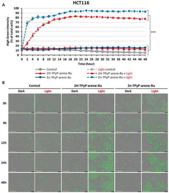 Quantitative analysis of activated caspases-3/-7 in HCT116 cells over 48 h. HCT116 cells were seeded and cultured for 36 h and then treated with 2H-TPyP-arene-Ru or Zn-TPyP-arene-Ru at IC50 concentrations. Cells were then irradiated, co-treated with caspases-3/-7 green reagent, and placed in the IncuCyte® S3 live cell analysis system. Every 2 h, cells were imaged at a rate of 4 images per well in phase contrast and green fluorescence using the ×20 objective. (A) The number of cells undergoing apoptosis was quantified using IncuCyte® software (version 2022A Rev1) using the ratio of the percentage of green fluorescent cells normalized by the percentage of total cells in each well over 48 h. Data are shown as mean ± SEM (n = 3). *** p < 0.001. (B) Representative images are shown for each condition at 0, 6, 12, 24, and 48 h. Yellow scale bar = 200 µm.