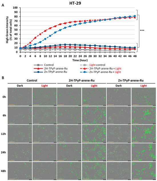Quantitative analysis of activated caspases-3/-7 in HT-29 cells over 48 h. HT-29 cells were seeded and cultured for 36 h and then treated with 2H-TPyP-arene-Ru or Zn-TPyP-arene-Ru at IC50 concentrations. Cells were then irradiated, co-treated with caspases-3/-7 green reagent, and placed in the IncuCyte® S3 live cell analysis system. Every 2 h, cells were imaged at a rate of 4 images per well in phase contrast and green fluorescence using the ×20 objective. (A) The number of cells undergoing apoptosis was quantified using IncuCyte® software (version 2022A Rev1) using the ratio of the percentage of green fluorescent cells normalized by the percentage of total cells in each well over 48 h. Data are shown as mean ± SEM (n = 3). *** p < 0.001. (B) Representative images are shown for each condition at 0, 6, 12, 24, and 48 h. Yellow scale bar = 200 µm.