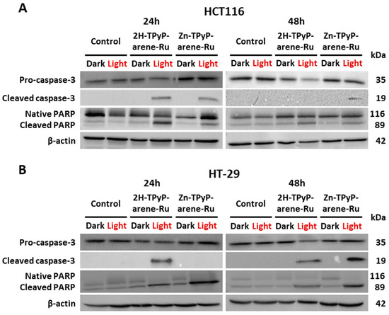 Effects of photoactivation of TPyP-arene-Ru on protein expression of apoptotic markers in HCT116 (A) and HT-29 (B) cells. Cells were seeded at the determined density and cultured for 36 h, then treated or not with 2H-TPyP-arene-Ru or Zn-TPyP-arene-Ru at IC50 concentrations. After 24 or 48 h incubation, the culture medium was replaced, and cells were irradiated or not. At 24 and 48 h post-irradiation, the cells were then recovered and protein expression determined via WB. β-actin was used as the reference protein.