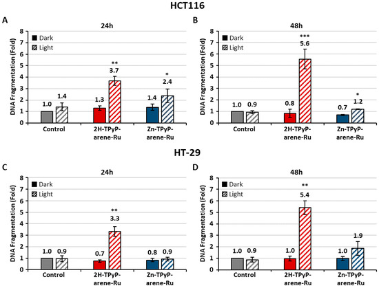 Effects of photoactivation of TPyP-arene-Ru on DNA fragmentation HCT116 (A,B) and HT-29 (C,D) cells. Cells were grown for 36 h in an appropriate culture medium before exposure or not to 2H-TPyP-arene-Ru or Zn-TPyP-arene-Ru complexes at IC50 concentrations. After 24 or 48 h incubation, cells were irradiated or not with a 630–660 nm CURElight lamp at 75 J/cm2 (PhotoCure ASA, Oslo, Norway). DNA fragmentation in both cell lines 24 h post-PDT (A,C) and 48 h post-PDT (B,D) was quantified from cytosol extracts via ELISA. Results are reported as n-fold compared to control. Data are shown as mean ± SEM (n = 3). * p < 0.05, ** p < 0.01 and *** p < 0.001.