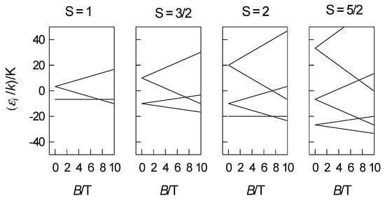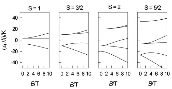 The application of the spin-Hamiltonian formalism offers modelling of the energy levels, magnetization, and magnetic susceptibility depending upon the spin quantum numbers S = 1, 3/2, 2, and 5/2. The corresponding spin matrices have dimensions of 3, 4, 5, and 6 in the basis set of spin kets . The members of the spin multiplets in the zero field are separated by amount D, 2D, (D, 3D), and (2D, 4D), respectively, as shown in Figure 1.